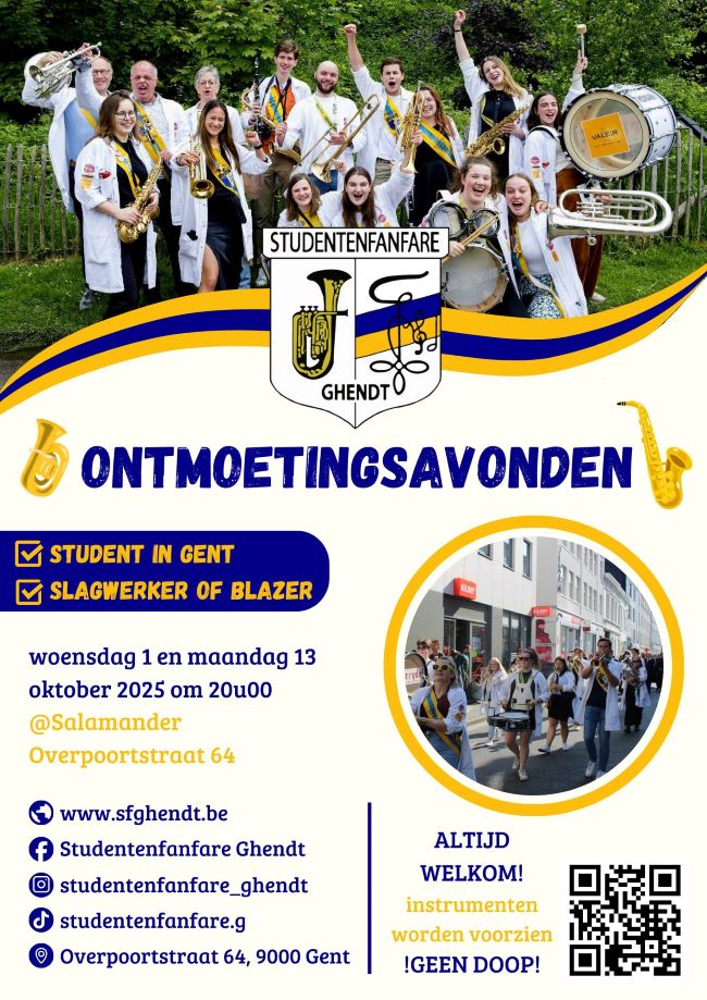 Moet er ambiance zijn op een cantus, een fuif, een galabal of een andere feestelijke aangelegenheid? Dan is succes verzekerd met een optreden van de Studentenfanfare Ghendt!